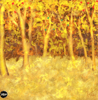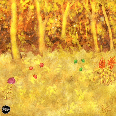 The path slowly descended to a clearing and I noticed everything around me was GOLDEN too, just like the webbed path. The trees, the plants, the grass under my foot, all of it!