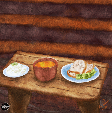 I saw a tiny hut that had a table full of delicious food. I knocked at the door but no one was around. I was so hungry I thought I would go in and grab something to eat. I first tasted the soup, but it was so SPICEY. Then I ate a little bit of rice, but it was so salty. I then saw some sandwiches and bit into them and they were just right.