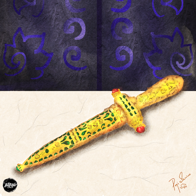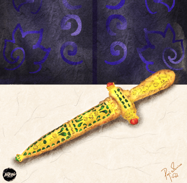 Something fell off the door. I jumped at the sound and noticed a beautiful bejeweled DAGGER at my feet. I was worried I had broken it. I quickly hid it in my pocket and thought I'll try to fix it later. Just as I put it in my pocket, the door slowly opened.