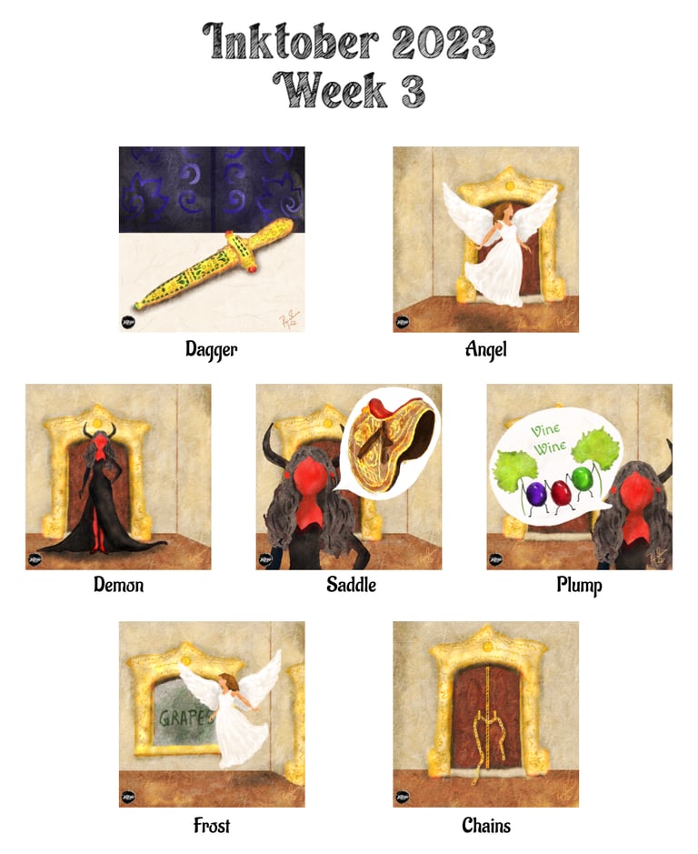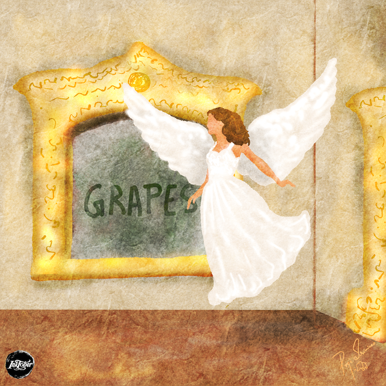 I wasn't sure of this one but I noticed the beautiful angel frantically signally me. She floated up to the FROSTed window and wrote the word Grapes on it. "Grapes," I shouted as she wiped off the window and floated back to her door.