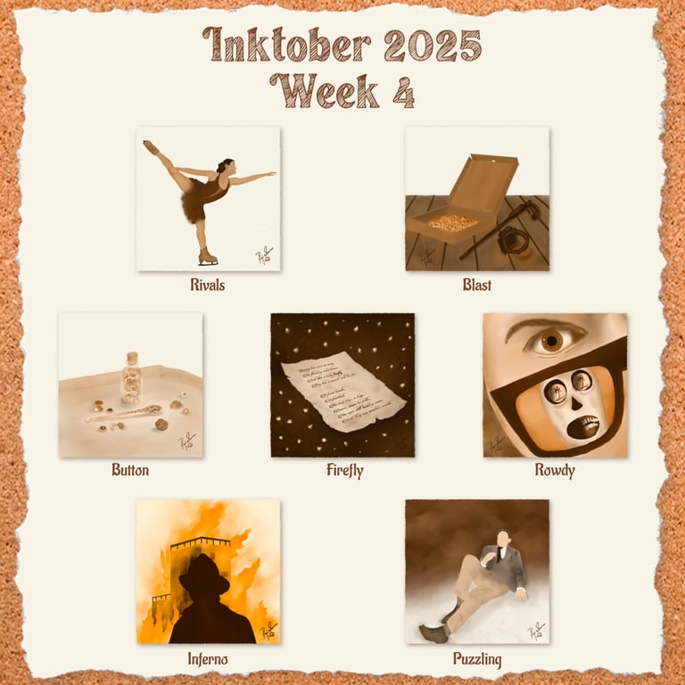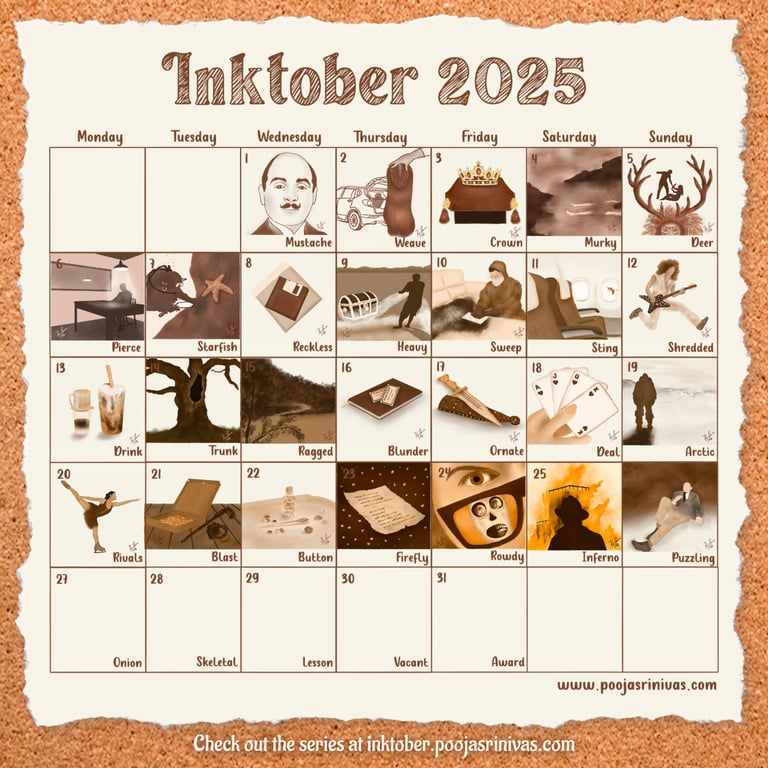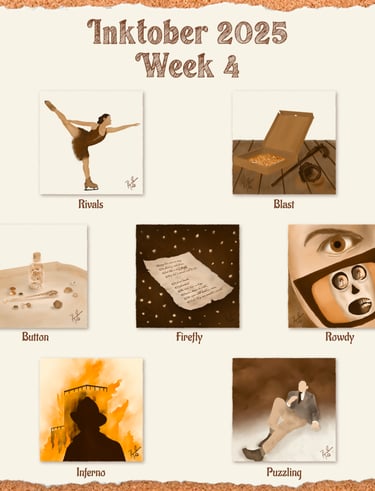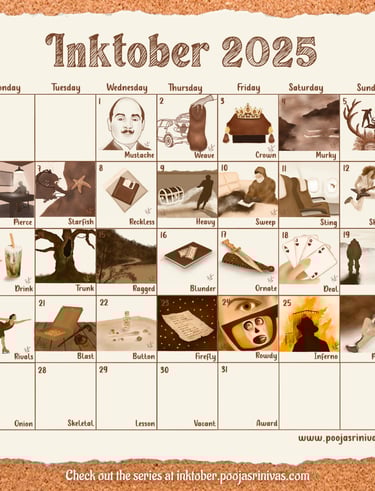 This Inktober, every prompt is a clue. I'm embarking on an Inktober journey through the lens of a detective, exploring each day's challenge with intellectual curiosity. To capture a timeless sense of elegance and intrigue, the series will be crafted with sepia-toned (digital) colored pencils against the rich texture of hand-made ivory deckled paper.