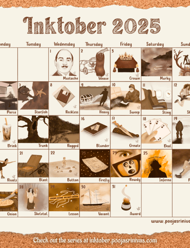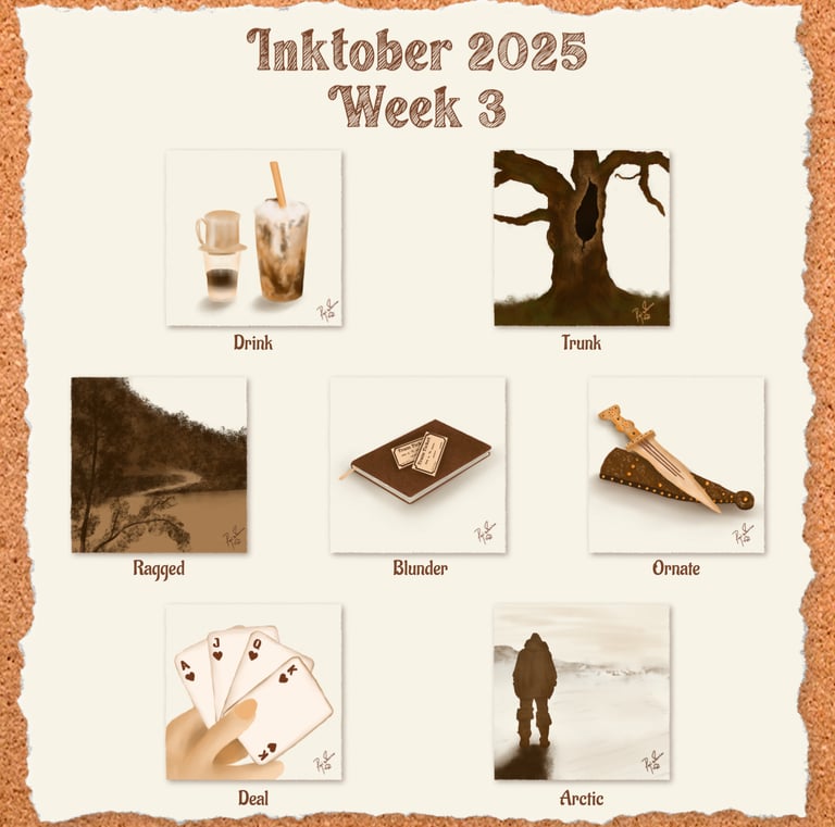 Time flies when you are having fun! Week 3 of Inktober brought along seven fascinating prompts that led me to some really cool stories, including a murder mystery card game and an exciting TV series I'm planning to watch. This week, I specifically focused on leveling up my rendering skills, making sure to push the textures in each piece, and refine my overall storytelling techniques. Let's see what the final two weeks have in store for us!